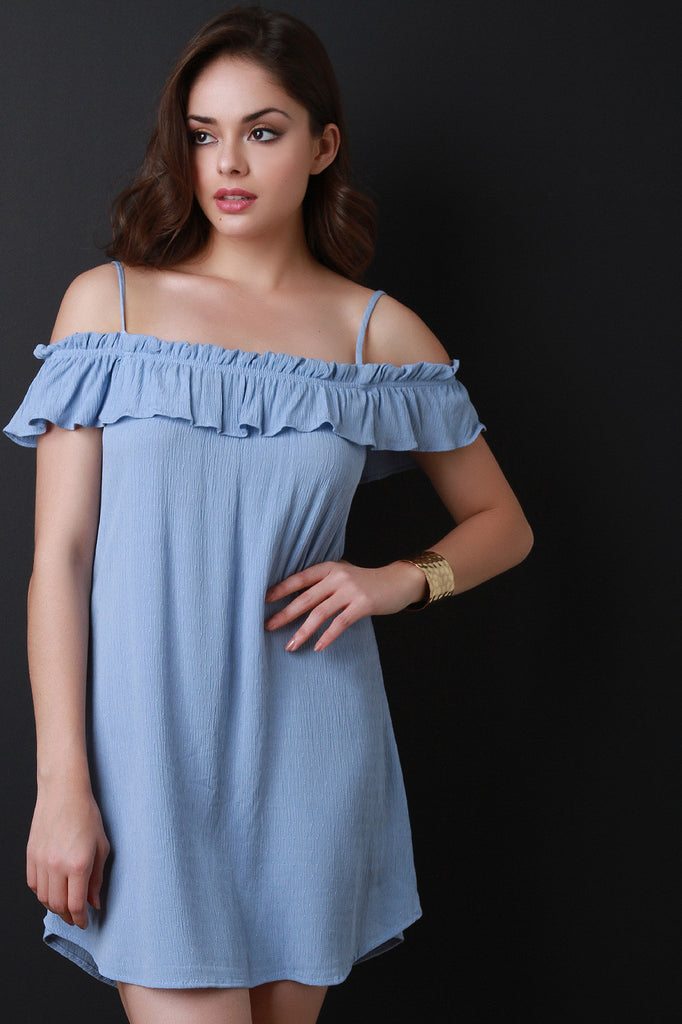 This mini dress features an elasticized off-the-shoulder with ruffle accents, short sleeves, spaghetti shoulder straps, and a textured fabrication. Accessories sold separately. Made in U.S.A. 100% Rayon.