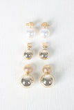 This earring set features three pairs of earrings that are all double-sided faux pearls with different post backs such as hearts, squares and textured circles.