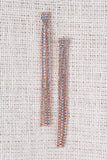 These long dangle earrings feature three rows of rhinestones in a gradient arrangement and finished with push backs.