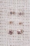 This set of stud earrings features three sets with ball studs, rhinestones, and an x design with post back closures.