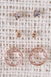 This set of earrings features three sets with ball studs, rhinestones, and an eight point open star design with post back closures.