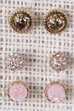 This set of earrings features three sets of different encrusted earrings with rhinestone detailing, faux stone studs, textured embellishments, and post back closures.