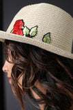 This hat is panama style with its pinched crown and brim. Stitched straw design, featuring a decor rose patch. Finished with interior ribbon lining. 100% paper.
