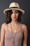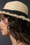 This panama style hat features a straw-like material, semi-wide brim, a ribbon cord detail, and a raw edge cut hem. Finished with interior ribbon lining. 100% Paper.