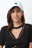 This cute baseball hat features a denim fabrication, classic 6-panel design, curved brim with distressed accents, an embroidered paw print at front, and finished with an adjustable strap back closure. Forehead lining. Pattern placement may vary. 100% Cotton.