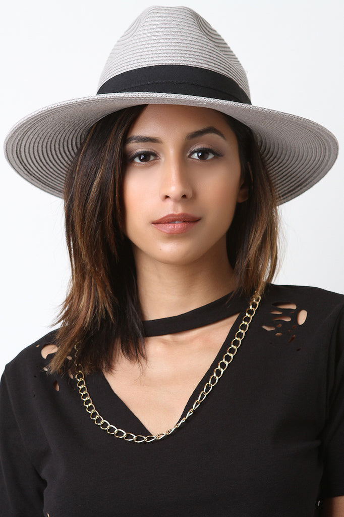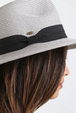 This hat is fedora style with its pinched crown and brim, featuring an attached ribbon trim and a stitched straw design. Finished with interior ribbon lining. 80% Paper, 20% Polyester.