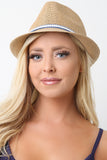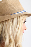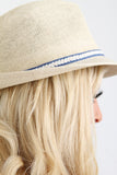 This hat is fedora style with its pinched crown and structured curved brim, featuring an attached blue accent braided trim around the crown. Finished with interior ribbon lining. 100% Paper.