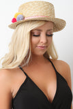 This summer time straw hat features a boater style design, structure round brim, braid trim accent with pom poms, and inner ribbon lining. 100% Grass.