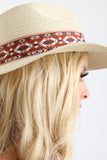 This hat is panama style with its pinched crown and wide brim. Straw design. Finished with an attached ribbon, featuring an aztec embroidery pattern. 100% Paper.