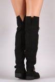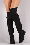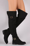 These riding boots feature a slouchy shaft and adjustable side buckles. Over the knee style. Partial inner side zipper. Round toe.