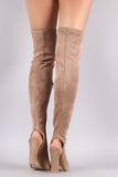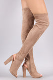 These over the knee boots feature a slightly stretchy fitted vegan suede shaft, peep toe design with an exposed back, and chunky wrapped heel. Finished with a lightly padded insole and partial side zip closure.