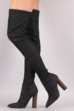 These boots are over the knee style. Fitted denim style. Single sole, featuring a pointy toe and a slightly rounded stacked chunky heel. Finished with a partial adjustable inner side zipper.