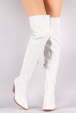 These western inspired boots feature a shimmery snake embossed PVC upper with elastic gusset insert, pointy toe silhouette, and chunky stacked heel. Finished with a cushioned insole and partial side zipper closure for easy on/off.