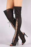 These over-the-knee boots feature a peep toe silhouette, netted mesh upper with vegan leather trim, and corseting lace-up design at front/back. Finished with a lightly cushioned insole and wrapped stiletto heel.