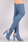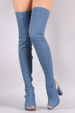 These stylish boots feature a peep toe, non-stretch tight fitted denim shaft, open heel counter, and cushioned insole. Finished with a wrapped chunky heel and partial inside zip closure.