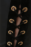 These sexy leggings feature smooth vegan leather fabrication, wide panel waist band, high-waist construction, sculptured fit, and finished with lace up detail on both ankles. Accessories sold separately. Made in U.S.A. 92% Polyester, 8% Spandex.