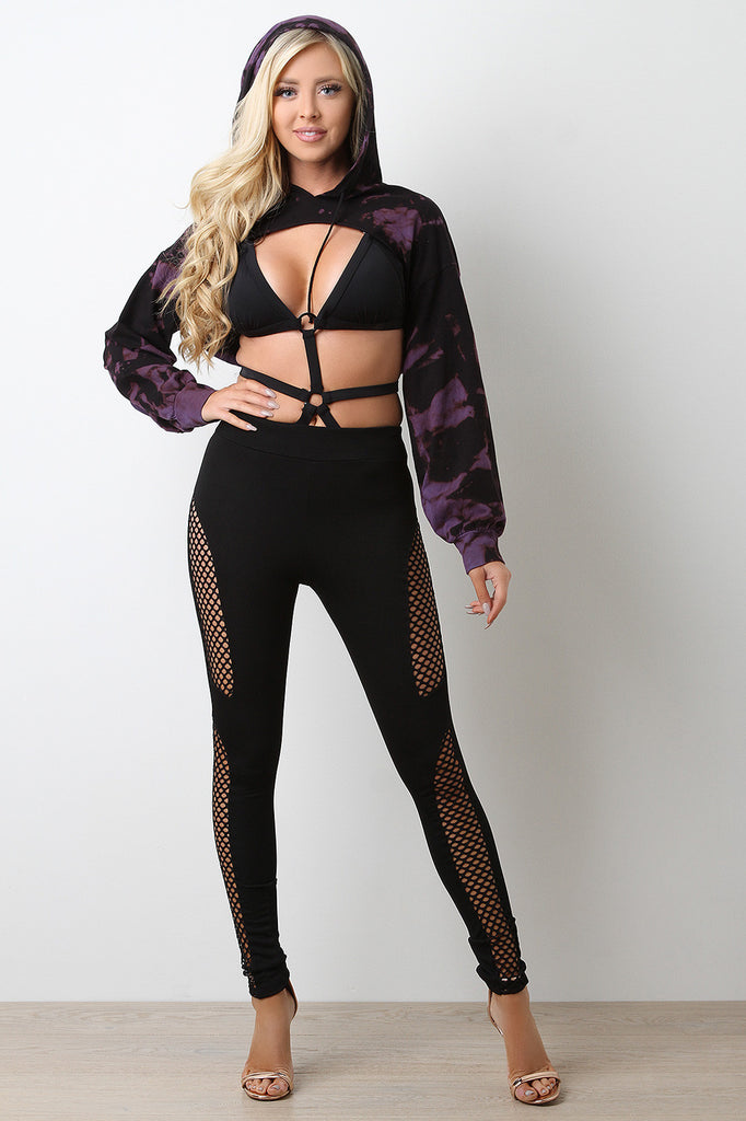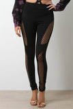 These leggings feature a solid stretchy knit with open fishnet inset design, elasticized high waist, and taper cut legs. Made in U.S.A. 95% Polyester, 5% Spandex.