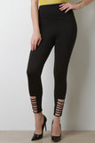 These legging pants feature a stretchy fabrication, elasticized wide panel high waist, and taper cut legs with a strappy design. Accessories sold separately. Made in U.S.A. 96% Polyester, 4% Spandex.