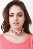 This choker features a embroidered band, vegan leather back, shells, and a colorful fringe circle. Finished with an adjustable lobster claw closure.