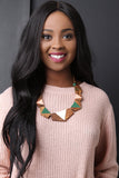 This necklace features a geometric design with pentagon shapes, contrasting triangle accents, beaded strand, and an adjustable lobster hook closure.
