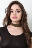 This choker necklace features a wide band, studded rhinestones, and an adjustable lobster claw closure.