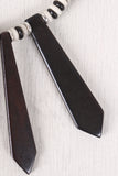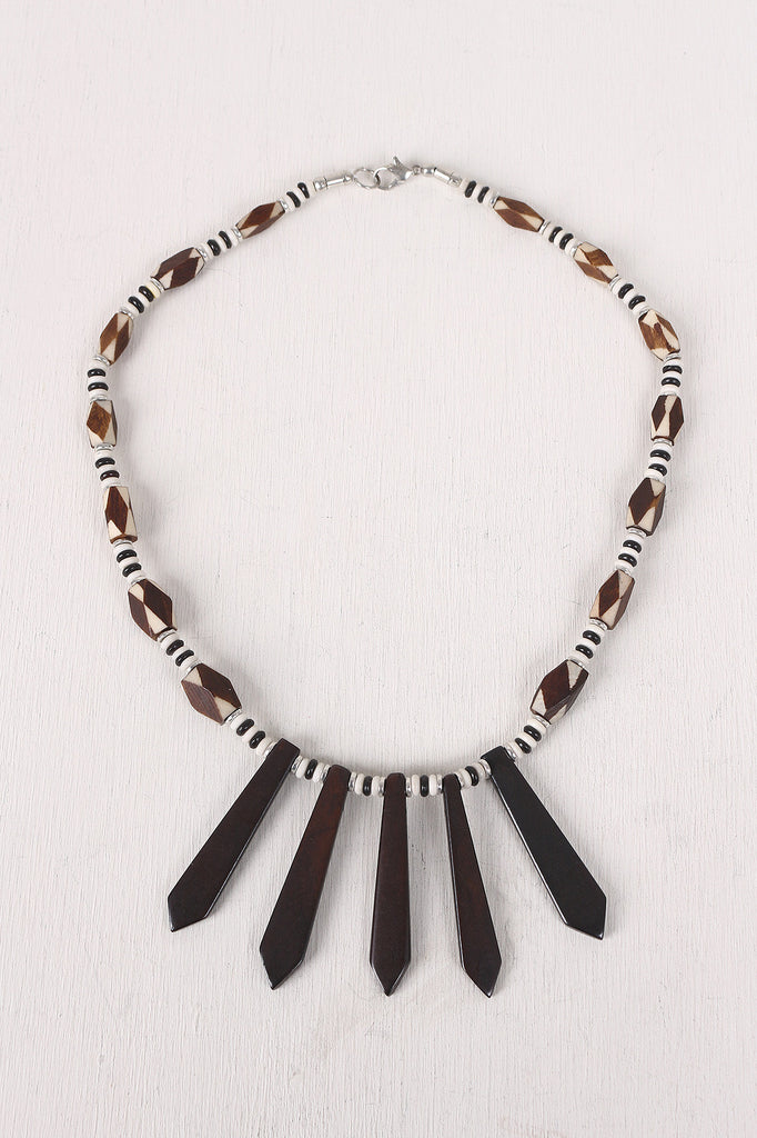This necklace features two tone wooden bead design, and lobster hook closure.