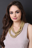 This lovely vintage necklace features an extra long design with gold-tone faux pearls. Includes matching drop pearl earrings with a fish hook closure and two elasticized pearl bracelets.