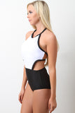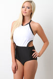 This one piece swimsuit features a high neck, self-tie halter, triangle back straps with s-hook closure, contrasting high waisted seam, brief bottom, padded cups, and fully lined. Accessory sold separately. 82% Polyester, 18% Spandex.