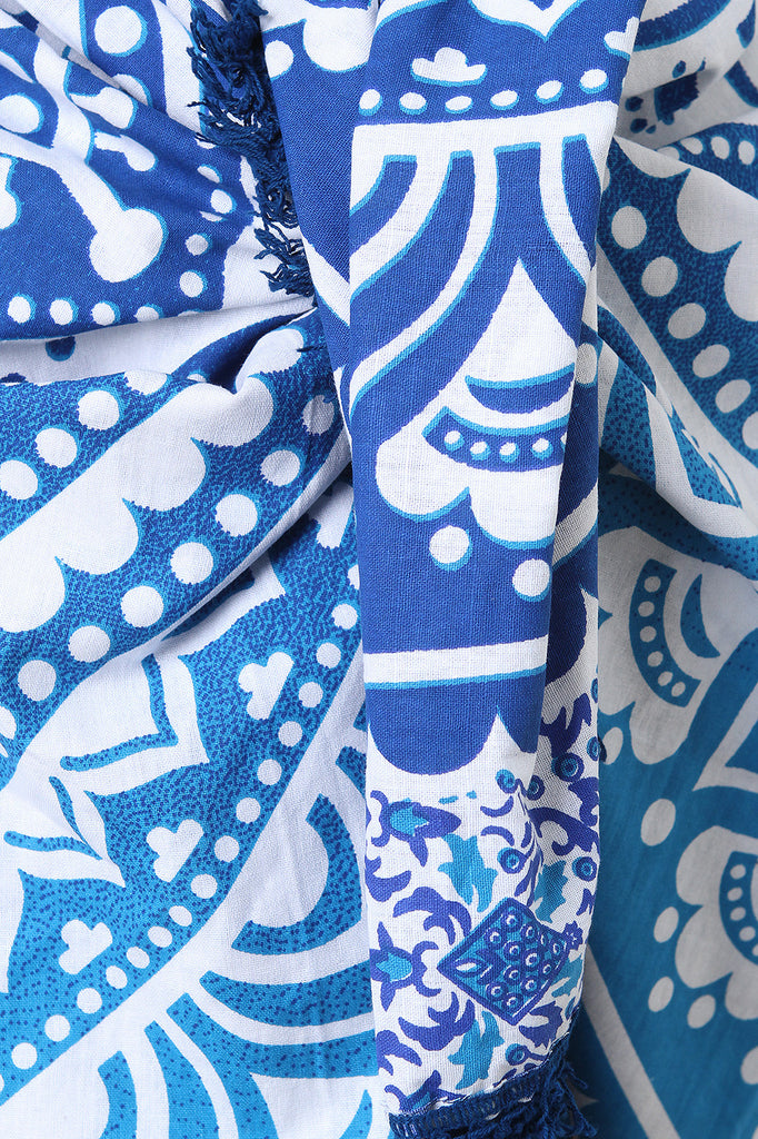 This blanket combo features a paisley print, multi-purpose use of a blanket, a cover up wrap, wall decor or a rug. It has circular shape and tassel hem detail. Accessories sold separately. 100% Cotton.