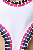 This one piece swimsuit features multi-colored trimming with a weaving design, a scooped neck, wide shoulder straps with hook and eye closures at back, side monokini designs, open back and a brief bikini bottom. Accessory sold separately. 90% Polyester, 10% Spandex.