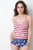 This tankini set features a v-neck, ruched yoke, racerback with caged sides, and removable padded cups. Contrast boy shorts features a runner hem, and fully lined. Accessories sold separately. 82% Nylon, 18% Spandex.