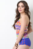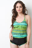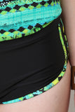 This tankini set features a v-neck, ruched yoke, racerback with caged sides, and removable padded cups. Contrast boy shorts features a runner hem, and fully lined. Accessories sold separately. 82% Nylon, 18% Spandex.