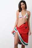 This summertime-fun, circle shape beach towel features a watermelon print design with contrasting seeds, and plush fringe trimming. 100% Polyester.