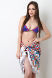 This circular shape beach towel features a bohemian mosaic design and plush fringe trimming. 100% Polyester.