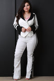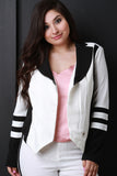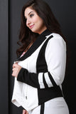 This plus size blazer jacket features contrasting panel construction, texture knit fabrication, off-center zipper front, notch collar, envelope hem, and long sleeves. Accessory sold separately. 96% Polyester, 4% Spandex.