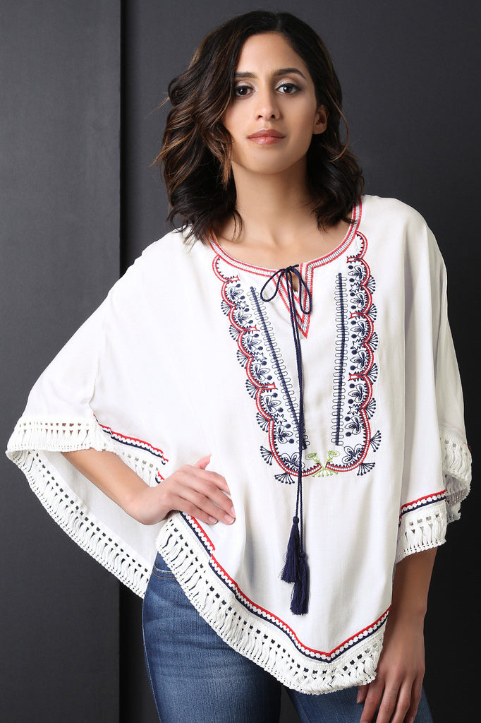 This lightweight poncho features a solid knit with a beautiful embroidery detail, poncho sleeves, tassel-tie neckline, and asymmetrical hemline.