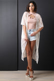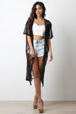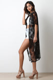 This long line kimono features a semi-sheer floral lace, open front, short sleeves, side slits, and long line hem. 100% Chiffon.