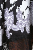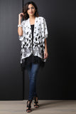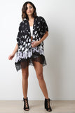 This lightweight floral print fabrication, elbow-length kimono sleeves, open front design, and lace-trim hemline. 50% Polyester, 50% Cotton.