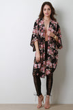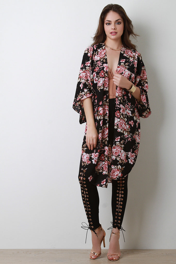 This cover-up top features a textured fabrication with a floral printed design, three-quarter length kimono sleeves, longline cut, and side vent slits. Accessory sold separately. Made in U.S.A 95% Polyester, 5% Spandex.