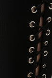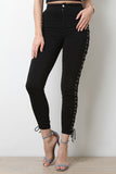 These taper cut pants feature stretchy knit fabrication, sculptured fit, open sides with lace up detail, zipper fly, and finished with a single button closure. Accessories sold separately. 69% Rayon, 26% Nylon, 5% Spandex.