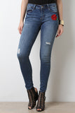 These jeans feature a denim design, rose embroidery, slightly distressed accents, belt loops, 5-pocket design, zipper fly with single button closure, and taper cut legs. Accessories sold separately. 98% Cotton, 2% Spandex.