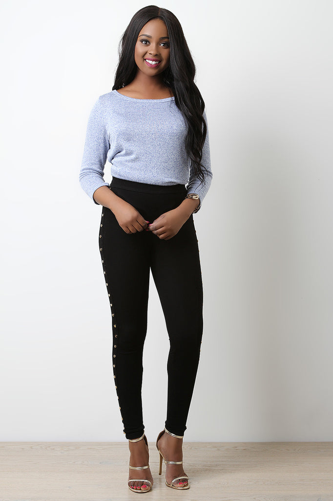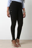 These leggings features a high rise elasticized waist, taper sculpture fit, and high polished studs along side. Accessory sold separately. 95% Cotton, 5% Spandex.