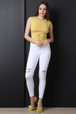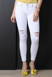These stretchy denim jeans features a low rise waist, belt loops, zipper fly, single button closure, pocket d�cor front, working back pockets, distress knees, and taper cut legs. Accessory sold separately. Made in U.S.A. 87% Cotton, 10% Polyester, 3% Spandex.