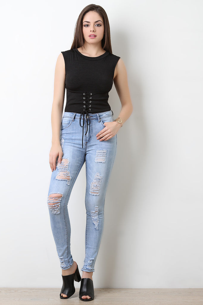 These skinny jeans feature a light wash denim with distress details at front, high waist design, five-pocket design, belt loops, zipper fly, and a single button closure. Accessories sold separately. 80% Cotton, 18% Polyester, 2% Spandex.