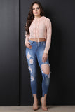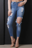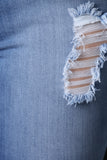 These denim jeans features a high waisted design, belt loops, 5-pockets, zipper fly, single button closure, stretchy taper fit, distress hoes, and a square raw hemline. Accessory sold separately. Made in U.S.A. 68% Cotton, 24% Modal, 7% T400, 1% Spandex.