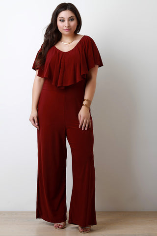 V Neck Ruffle Trim Wide Leg Jumpsuit
