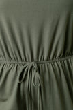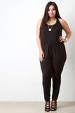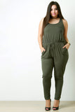 This casual plus size jumpsuit features a soft jersey knit fabric, scoop neckline, crisscross back bands, and two side pockets. Finished with an elasticized waist with self-tie drawstring detail and taper cut legs. Accessories sold separately. Made in U.S.A. 90% Polyester, 10% Spandex.