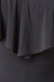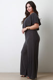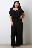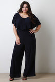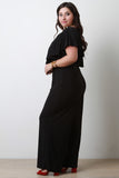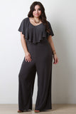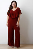 This plus size jumpsuit features a thin knit fabrication, v neckline, ruffle trim style sleeve, back button closure, fitted waist, and a wide leg flowing pant. Accessories sold separately. Made in U.S.A. 95% Polyester 5% Spandex.