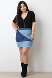 This skirt features contrasting geometrical panel design, hidden side zipper and a fringed mini length hemline. Accessory sold separately. 80% Cotton, 18% Polyester, 2% Spandex.