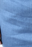 This skirt features a stretchy denim fabrication, waist panel seam, zipper back, and an overlapping asymmetrical envelope hemline. Accessory sold separately. 95% Cotton, 5% Spandex.